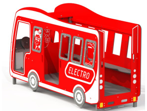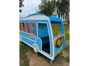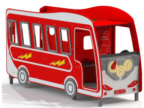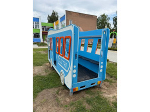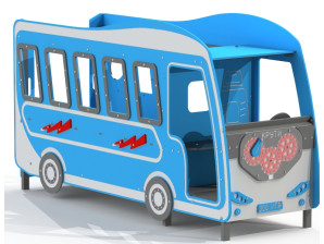Боковые части конструкции выполнены в виде тематической фигуры кабины автобуса с декоративным оформлением в виде окон. Внутри кузова автобуса расположено окно в кабину водителя и 2 развивающих бизиборда-игры водилки. Панели изготовлены из трехслойной HDPE панели толщиной 15 мм. Материал имеет UV стабилизатор, высокую прочность, стойкость цвета, устойчивость к атмосферным осадкам.