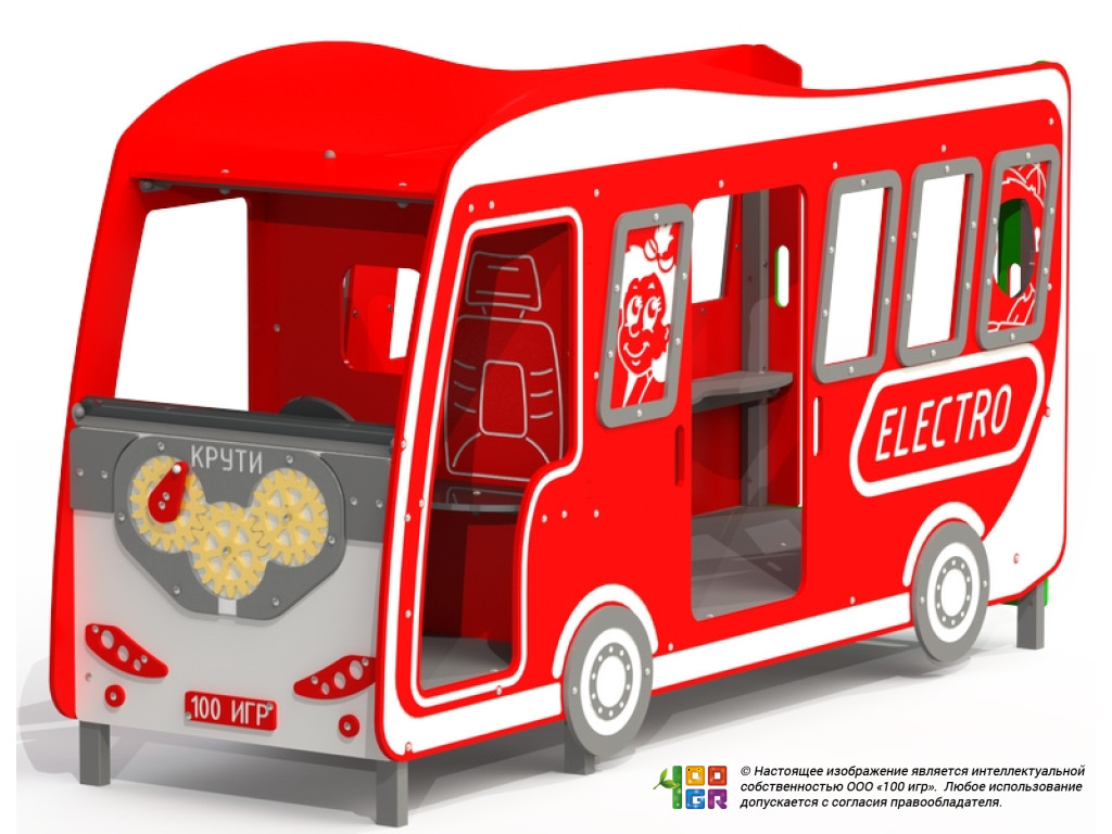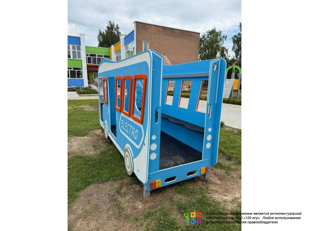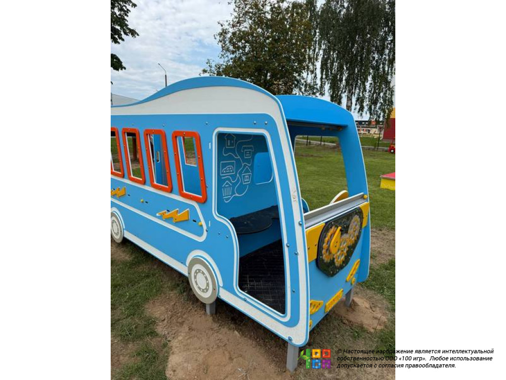 Детский игровой комплекс представляет собой модульную сборно-разборную конструкцию с высотами от земли 0,3м. Конструкция выполнена в виде автобуса с развивающими играми и бизибордами в количестве 6 шт. ИК Автобус состоит из: