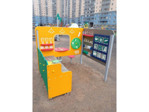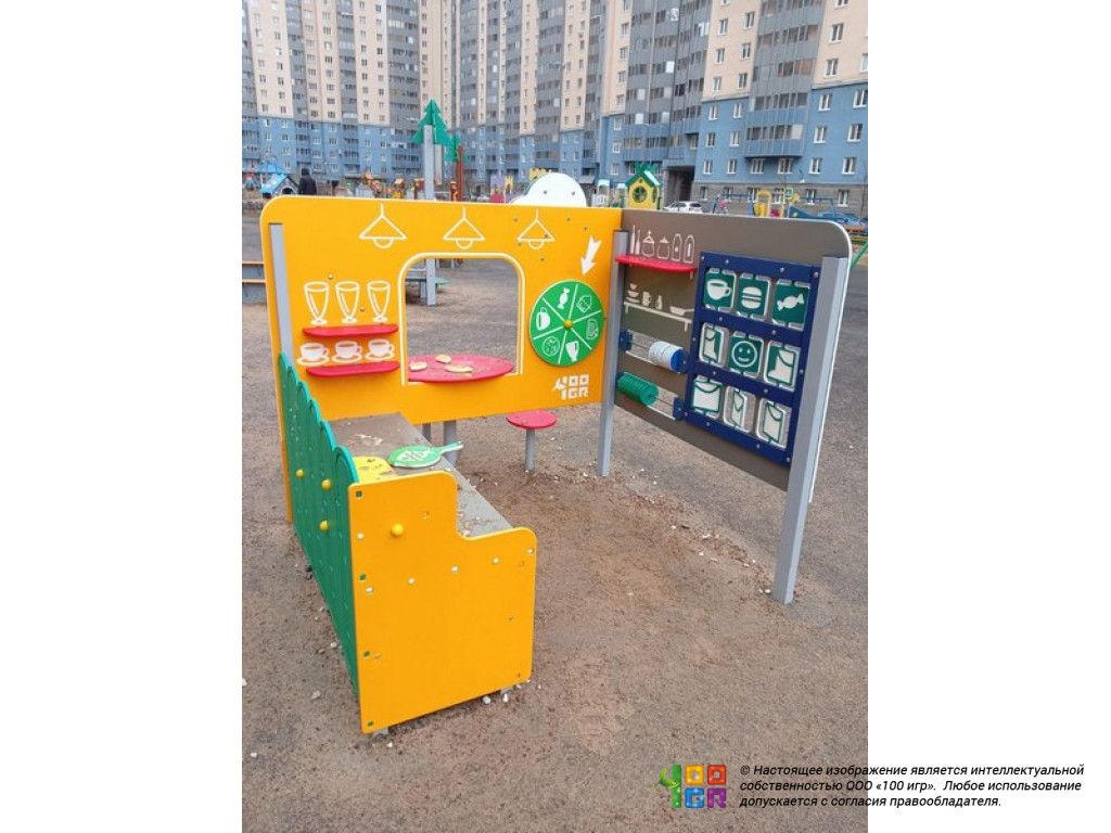 Модуль угловая стенка, на которой расположены бизиборды: «Найди пару», «Счеты», «Съедобное не съедобное», бегунки в виде конфет и накладки-аппликации в виде сладостей, полки с фрезерованной кухонной утварью, лампами и меню. Каркас изготовлен из профильной трубы.