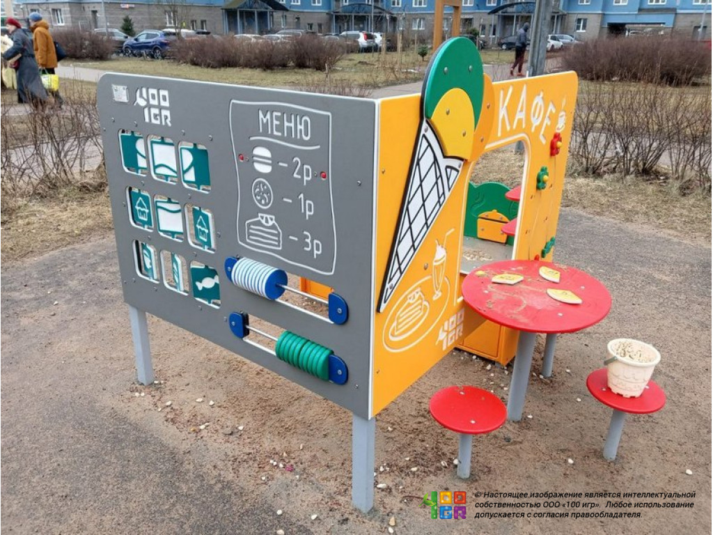 Детская игровая модель представляет собой модульную сборно-разборную конструкцию. Конструкция представляет собой тематическую пространственную фигуру в виде «Кафе» с игровым элементом «Кухня» и игровым столиком.