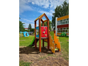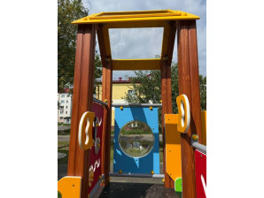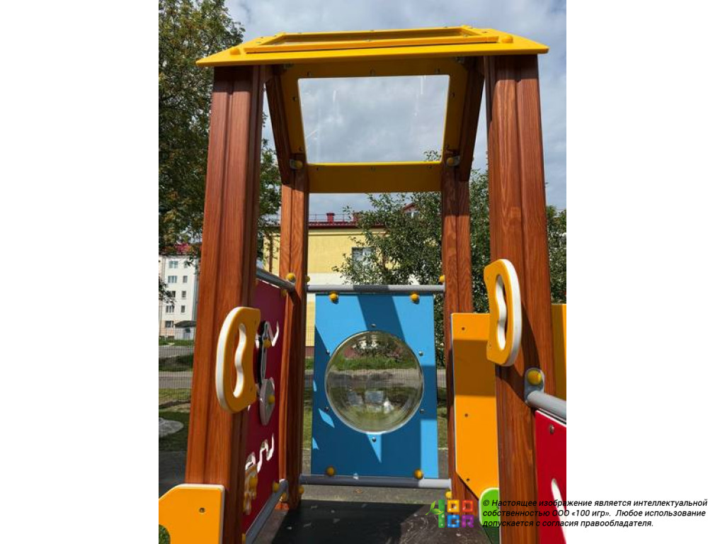 Каркас является основой для детского игрового комплекса. Каркас имеет несущие столбы, выполненные из клееного бруса сечением 100х100мм, по краям имеют скругленную фаску, радиус закругления 10мм. Вдоль бруса изготовлен концентратор напряжения (фрезерованная канавка посередине вдоль бруса). Сверху столб заканчивается пластиковой заглушкой. Снизу столб имеет металлический подпятник из металлической трубы Ø42,3мм, металлической пластины 2,5мм. Металлический контур рамы – профильная металлическая труба сечением 20х40х1,5мм. Обвязка пола выполнена из металлической профильной трубы 20х40х1,5мм. Пол – из антискользящей ламинированной фанеры толщиной 18мм, крепится к обвязке пола с помощью конфирмантов 6мм. Перекладина - из металлической трубы Ø33,5мм. Ручки - полипропилен (ПНД).