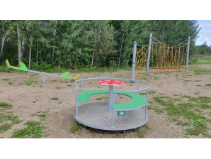 Рама карусели на металлическом валу с подпятником, подшипниками и корпусом, с сидениями, с металлическими спинками, поручнями для рук. Рама пола выполнена из профильной трубы сечением не менее 40х20мм. Настил пола выполнен из алюминиевого листа толщиной 3мм. Сидения и столик изготовлены из пластика HDPE толщиной 15мм. Поручни выполнены из металлической трубы Ø26,8мм. Стойка карусели выполнена из металлической трубы Ø75,5-89мм. Закладная деталь крепится болтовым соединением к карусели.