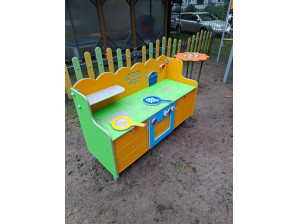 Модуль с кухонной зоной. Каркас изготовлен из профильной трубы 40х40х1,5 мм, куда входит модель плиты с 4-мя конфорками, разделочный стол, с фрезеровкой в виде разделочной доски с продуктами, тарелки с столовыми приборами, съемными сковородками, с функциональным наполнением. Модель имеет двухуровневый фрезерованный фасад, стилизованный под духовку, с вращающимися кнопками регулировки приготовления пищи; ящики, тумбу, кастрюлю, вращающиеся стрелки кухонных часов, полки. Пространственная фигура собирается из боковых, фасадных и задней стенок, и столешницы.