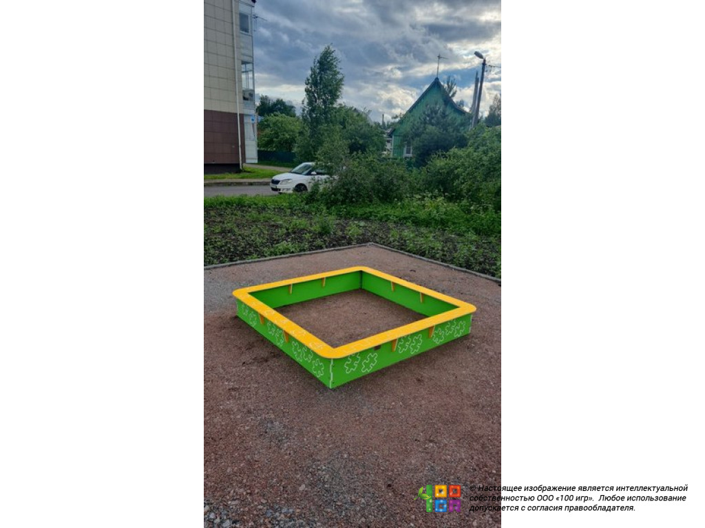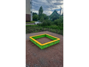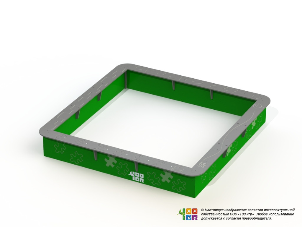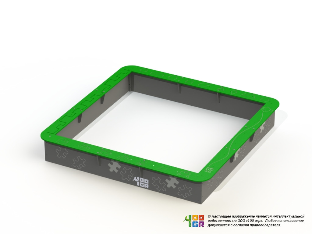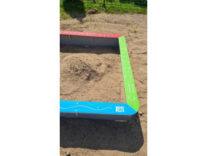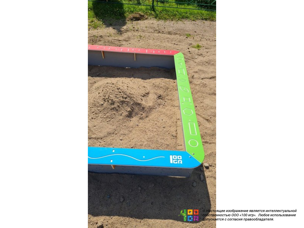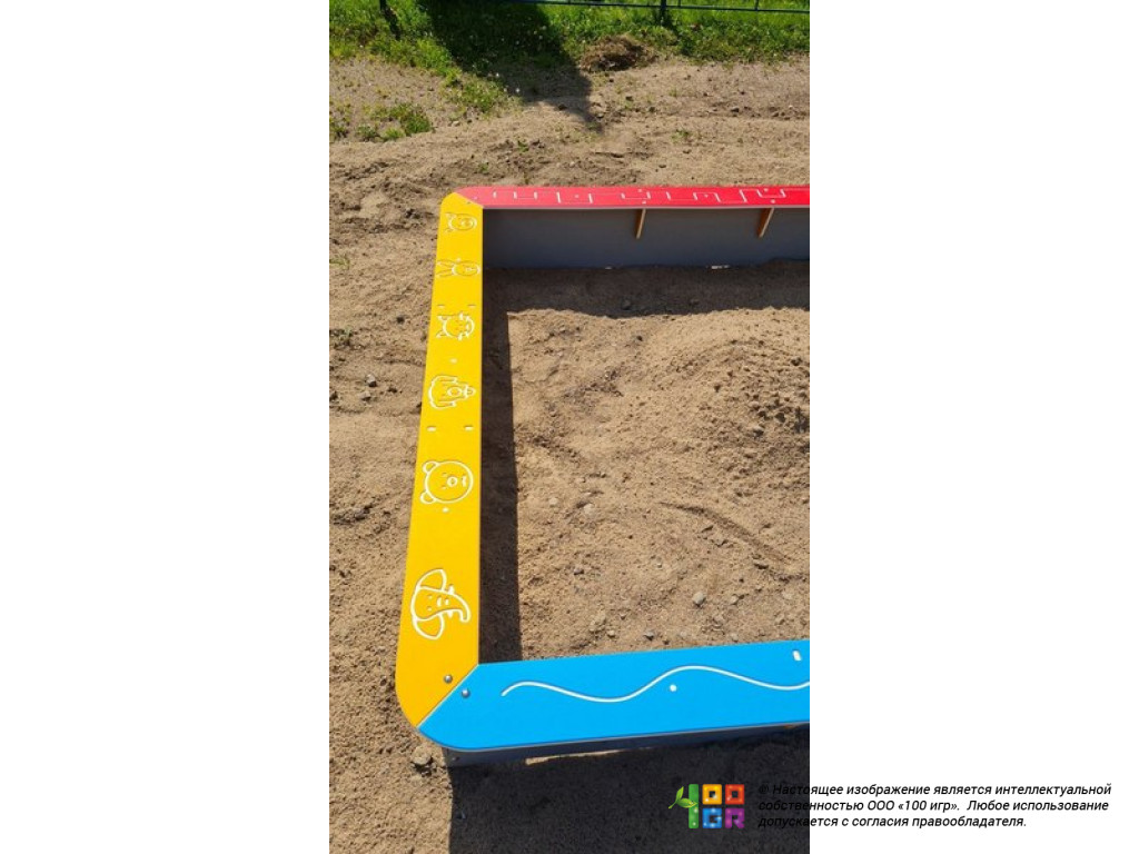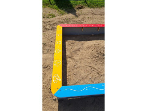 Угловая стойка выполнена из металлического профиля 20х20 и металлической пластины 60х60мм. Каркас (борта) песочницы и столешницы выполнены из тиснённого с двух сторон трехслойного цветного HDPE пластика толщиной 12мм, устойчивого к атмосферным и ультрафиолетовым воздействиям.