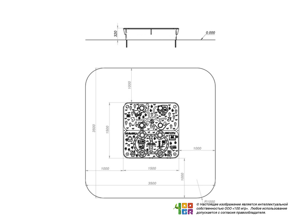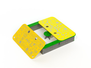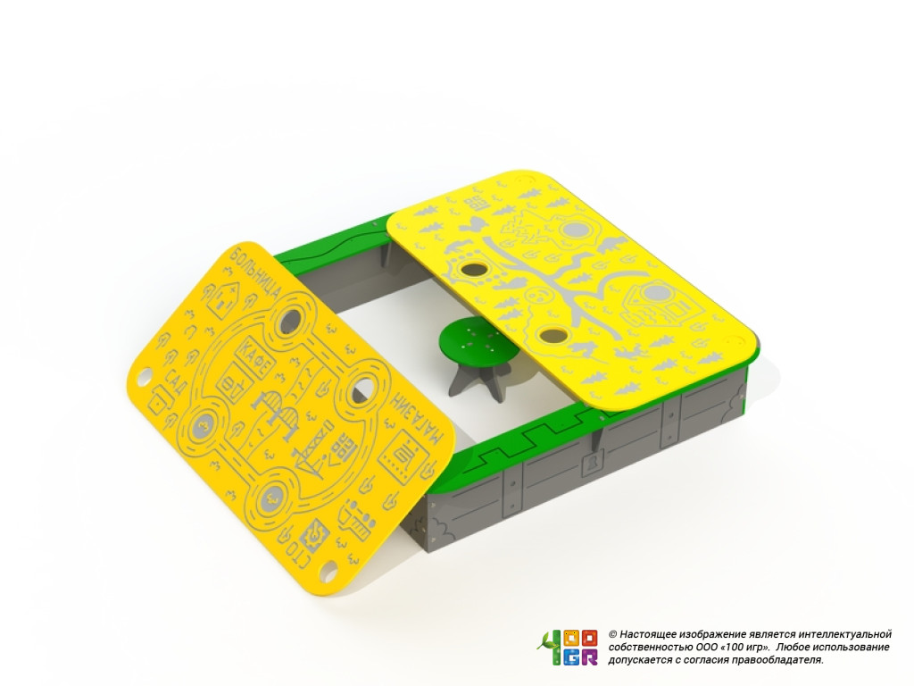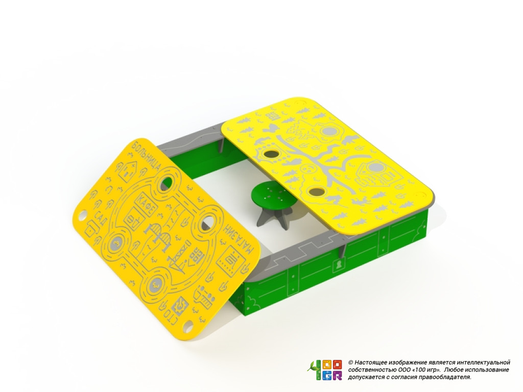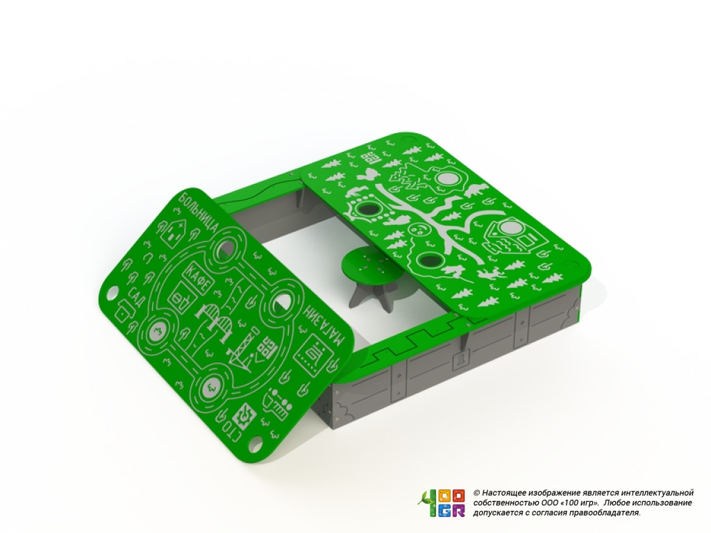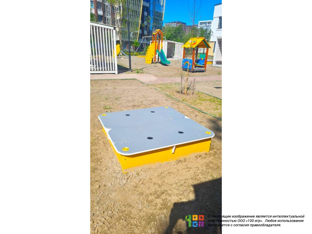 Угловая стойка выполнена из металлического профиля 20х20х1,5 и металлической пластины 60х60х2мм. Каркас песочницы выполнен из пластика HDPE толщиной 12мм. Песочница закрывается крышкой, которая изготовлена из пластика HDPE толщиной 12 мм, устойчивого к атмосферным и ультрафиолетовым воздействиям .Вся конструкция имеет скругленные безопасные углы и края. Все металлические элементы окрашены полимерным порошковым покрытием. Крепеж игрового элемента изготовлен из нержавеющей стали 304. Все болтовые соединения закрыты пластиковыми заглушками.
